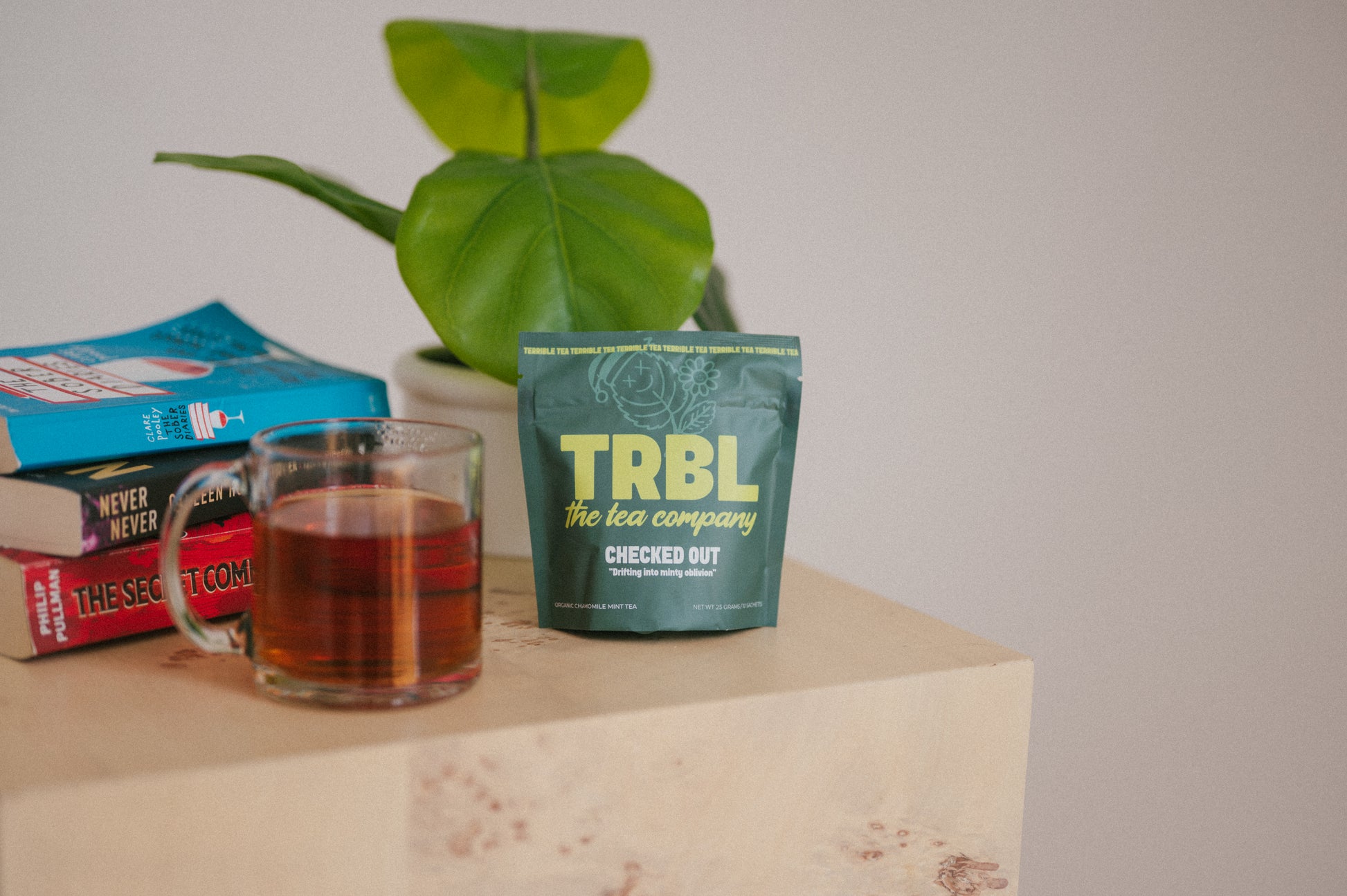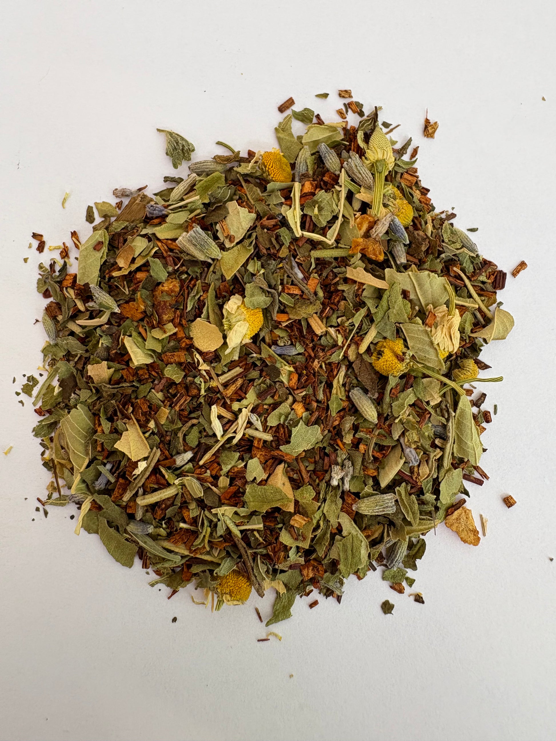 A mellow, minty herbal knockout laced with valerian root, chamomile, and rooibos — crafted to shut your brain up gently (no pharmaceuticals required).