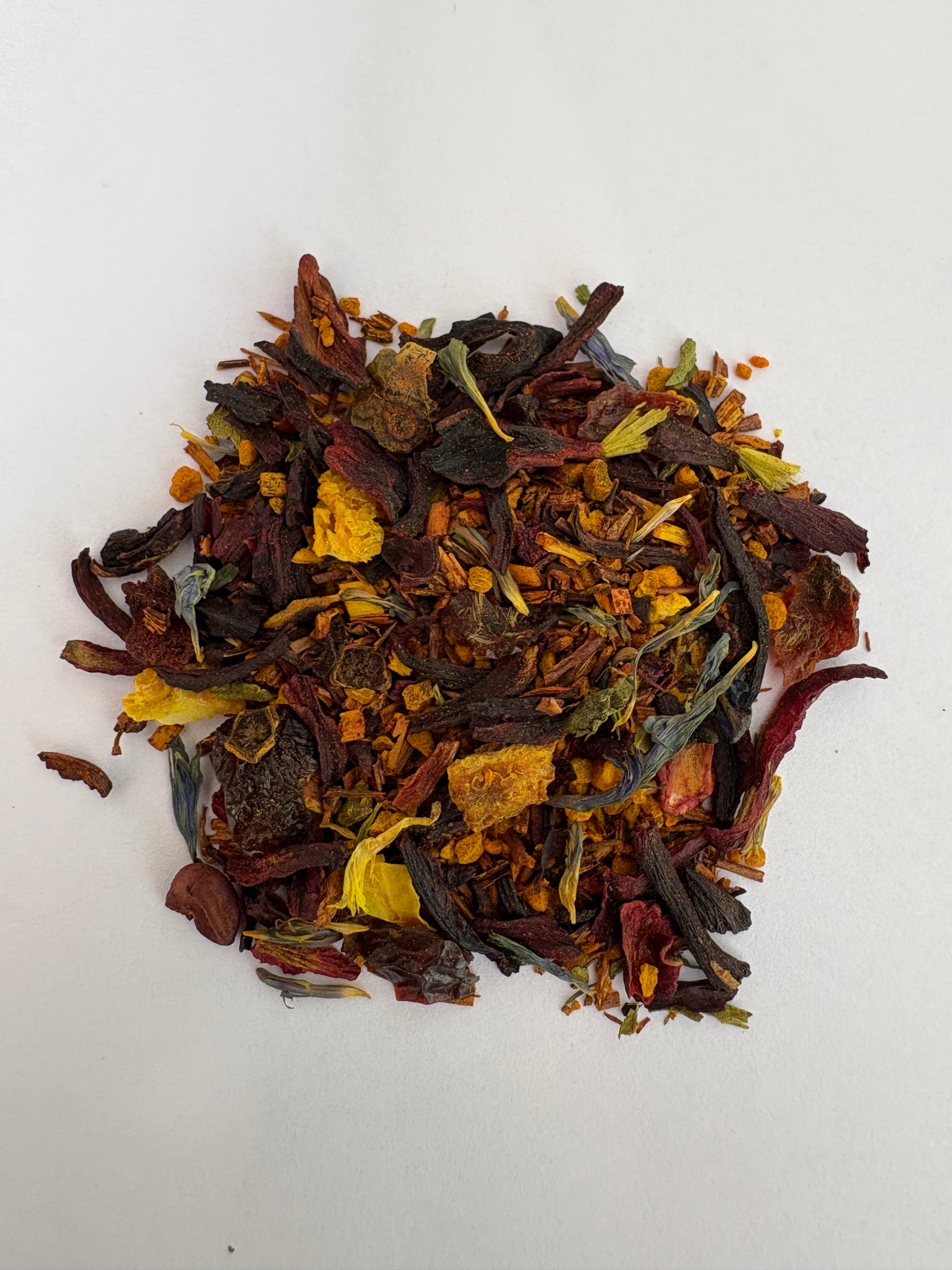 A caffeine-free, flavor-forward blend packed with anti-inflammatory turmeric, tart hibiscus, and calming rooibos—designed to support your immune system without turning into a full-on wellness lecture.